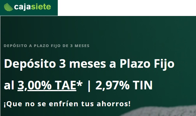 11 de diciembre del 2024 Caja Siete lanza un depósito a 3 meses de plazo y al 3% TAE para nuevos clientes de la entidad o para clientes que incrementen el saldo en el banco.