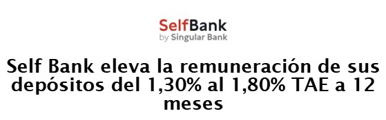 16 de diciembre del 2025 Self Bank sube la rentabilidad de todos sus depósitos, ofreciendo ahora como máximo un 1,8% TAE a 12 meses de plazo, que además ha sido el que más ha subido, un 0,5 puntos porcentuales.