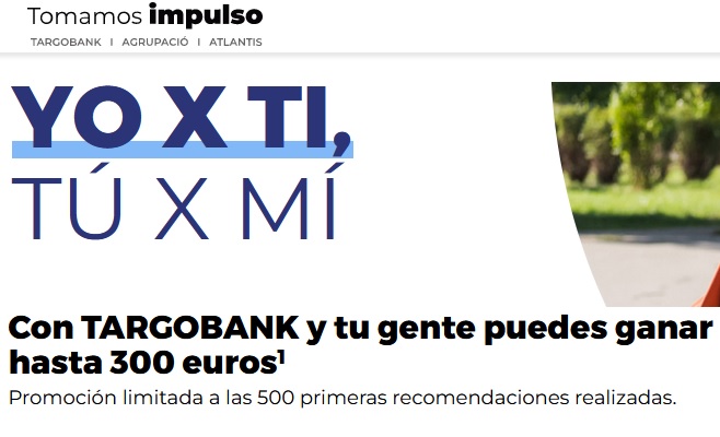 09 de agosto del 2023 TargoBank sigue ofreciendo su Plan Amigo, en el que el cliente (padrino) y el nuevo cliente (ahijado) puede conseguir cada uno 30€ por la contratación de la Cuenta Próxima, una Cuenta Suscripción PRIME y/o un depósito a plazo fijo.