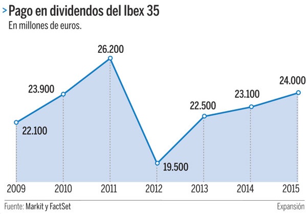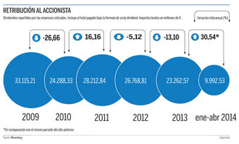 Las empresas del IBEX 35 repatirá un total de 23.100 millones de euros en dividendos en 2014, lo que supone un incremento del 3% con respecto a año anterior.