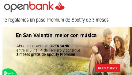 Openbank regala música gratis a través de una suscripción de 3 meses gratuitos a Spotify Premium a los nuevos clientes que abran una cuenta en la entidad hasta el día de San Valentín.