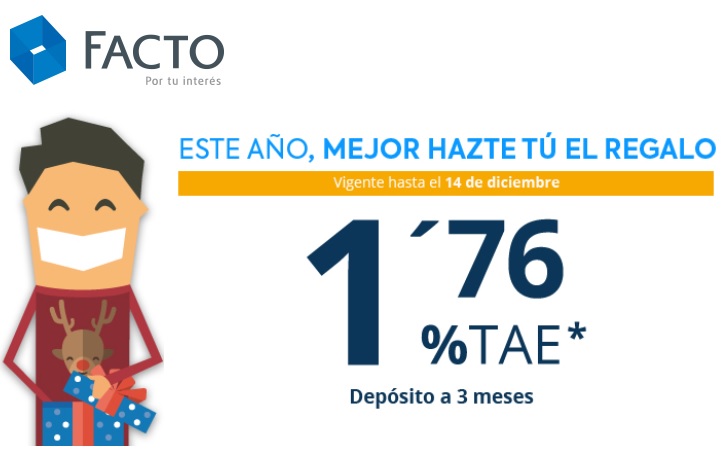 Cuenta Facto (Banca Farmafactoring) ha estado ofreciendo al 1,76% TAE todos los depósitos que contrates de hasta 92 días de plazo desde el 27 de octubre y el 14 de diciembre de 2017.