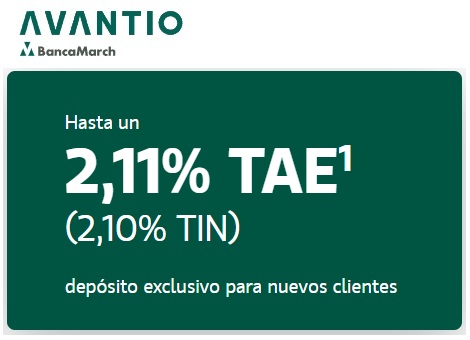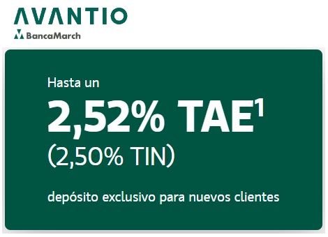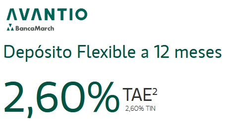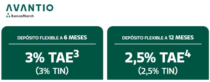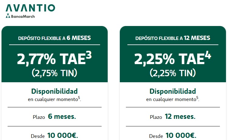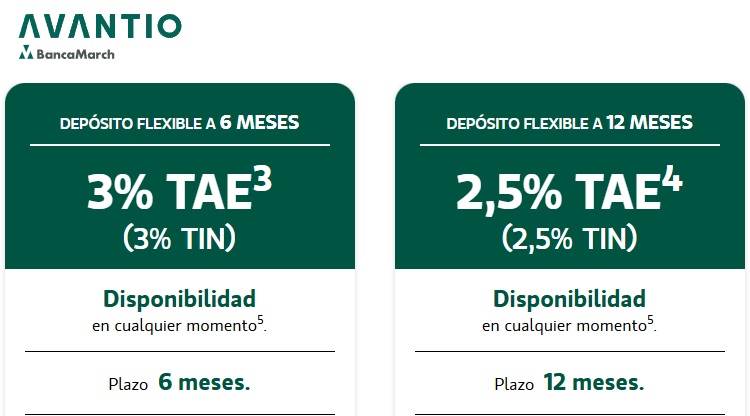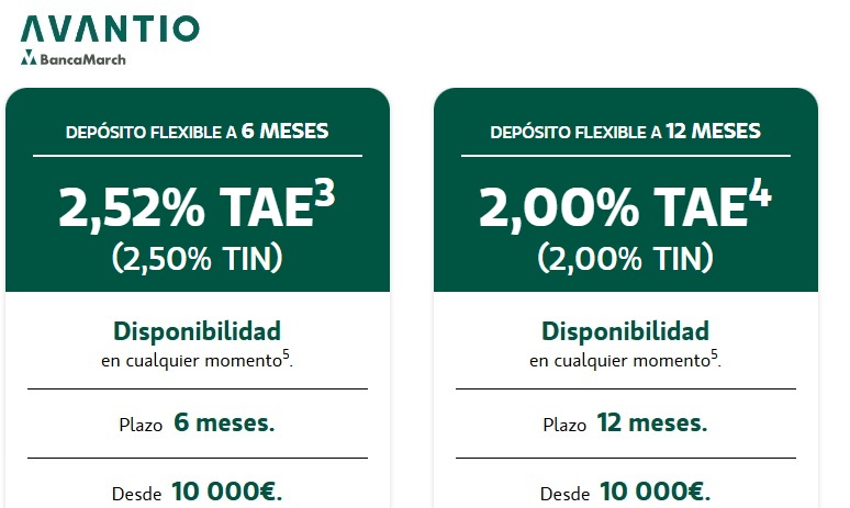 Banca March está ofreciendo su Depósito Flexible Avantio al 2,52% TAE y 2,00% TAE en plazos fijos a 6 y 12 meses respectivamente, solo hasta el 4 de mayo de 2025.