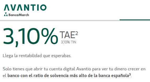 Banca March sube la rentabilidad de su depósito Flexible Avantio a 12 meses de plazo hasta el 3,1% TAE para nuevos clientes digitales.