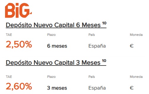Si en el mes de pasado, Banco Big eliminó su depósito a 6 meses para los clientes y sin exigencias, ahora el banco relanza el de 6 meses y al 2,75% TAE y otro nuevo a 12 meses y al 2,5% TAE.
