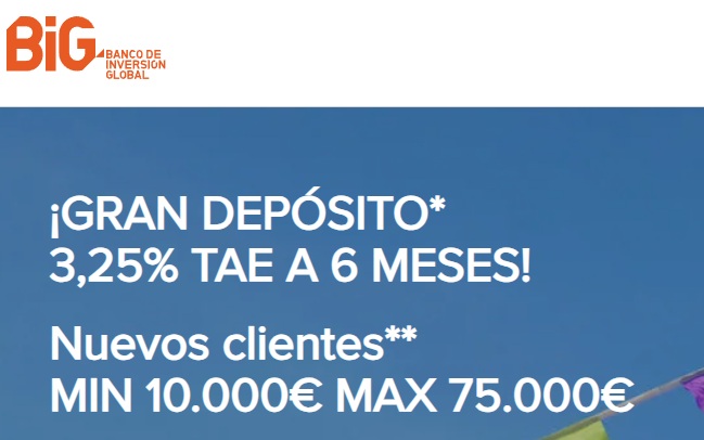 Banco BIG lanza un depósito de captación de dinero nuevo a 6 meses de plazo y al 3,25% TAE.