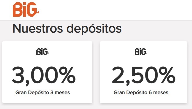 Banco BIG baja la rentabilidad de sus 2 depósitos para nuevos clientes, los denominados Gran Depósito, desde el 4% TAE hasta el 3,75% TAE el de 3 meses de plazo y desde el 3,6% TAE hasta el 3,25% TAE el de 6 meses de plazo.