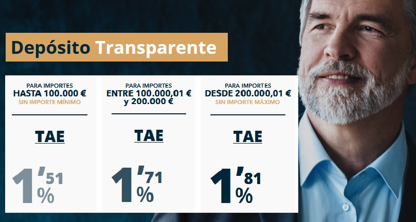 La entidad ofrece una rentabilidad base de 1,5% TAE para todos los depósitos de hasta 100.000€, pero si pones más, hasta 200.000€ te da 1,7% TAE, y si aún pones más, el banco te da un 1,81% TAE.