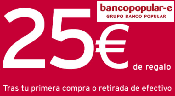 El Banco Popular-e continua ofreciendo 25 euros durante el mes de marzo de 2016 en efectivo de regalo a los que contraten su tarjeta de crédito gratuita.