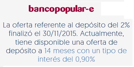 Tal y como avisamos, el Banco Popular-e.com comienza a anunciar en su página web la nueva rentabilidad de su depósito a 14 meses para nuevos y clientes de la entidad al 0,9% TAE.