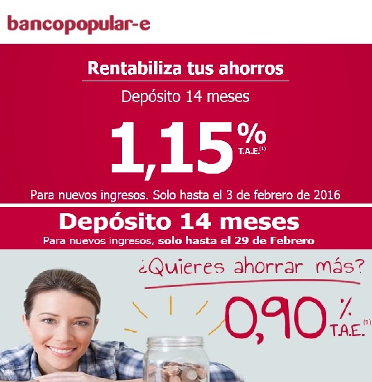 El Banco Popular-e rebajará la rentabilidad de su depósito bancario a 14 meses de plazo al 1,15% TAE que venía ofreciendo, hasta el 0,9% TAE a partir del día 4 de Febrero y hasta el 29 de Febrero.
