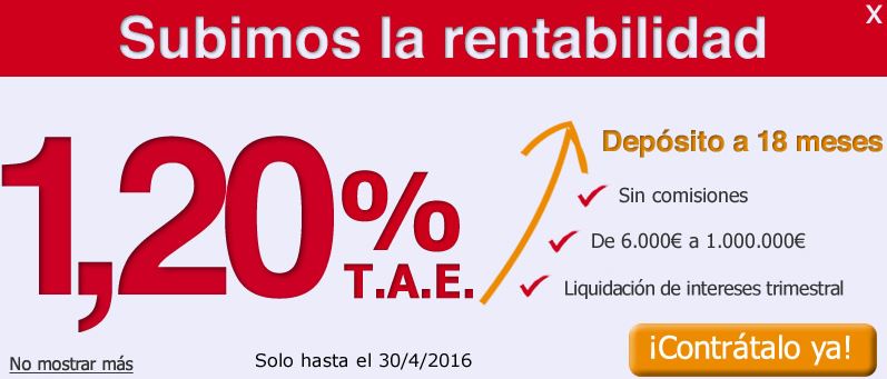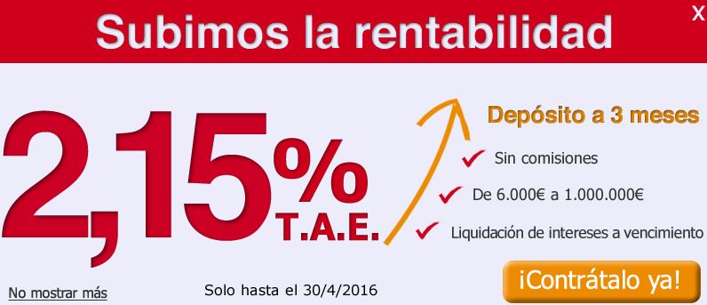 Si en el mes de marzo, clientes de la entidad nos comunicó que les estaban ofreciendo depósitos variopintos de hasta el 2% TAE, este mes, ofrecen más o menos los mismos plazos, pero llegando a dar hasta el 2,15% TAE.