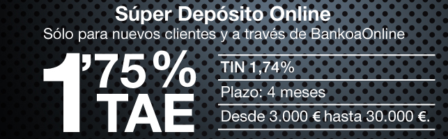 Bankoa rectifica ligeramente y sube la rentabilidad de su Depósito Bienvenida 2, llamado Super Depósito Online, desde el 1,5% TAE hasta el 1,75% TAE. Supone una subida del 0,25 puntos porcentuales en su rentabilidad.