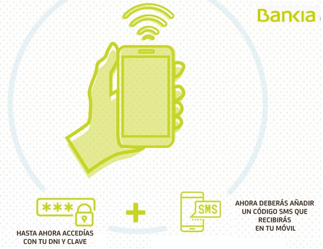 De esta forma para acceder a Bankia online o App Bankia se exigirá además de DNI y clave de acceso, un código SMS que se envía al teléfono móvil del cliente con un código.