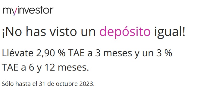 MyInvestor limita su oferta de depósitos, 2,902,% TAE a 3 meses y 3,00% TAE a 6 y 12 meses, sólo hasta 31 de octubre, y pensamos que sí, porque después debería de subirlo.