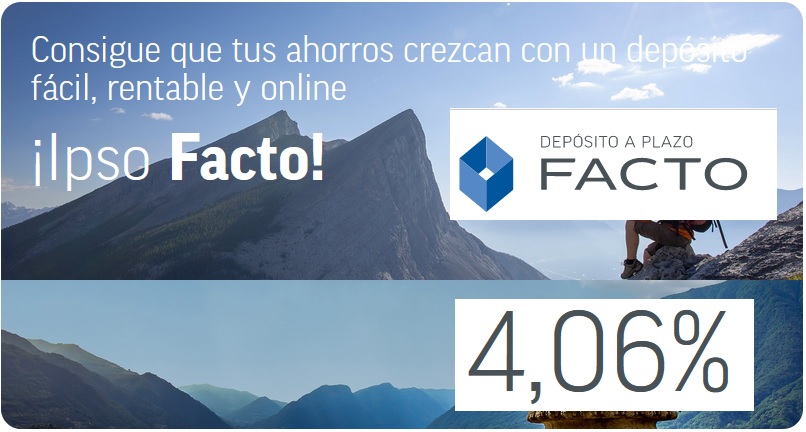 Facto sube hasta el 4,32% TAE sus depósitos desde 6 meses a 9 meses y ofrece al 4,06 TAE desde los 3 meses hasta los 6 meses, sin duda son imbatibles a corto plazo.