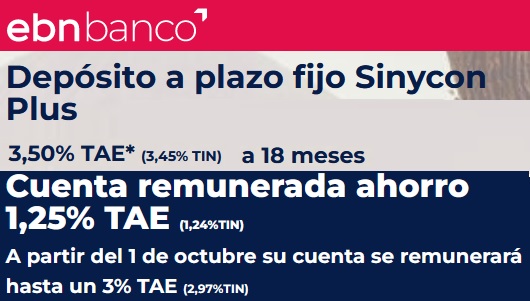 EBN Banco sigue ofreciendo por tiempo indefinido sus depósitos al 3,1% TAE y a cualquier plazo que elijas: 3, 6, 9, 12, 18, 24 o 36 meses y su cuenta de ahorro al 3% TAE para todos los clientes.