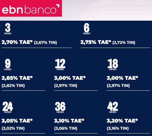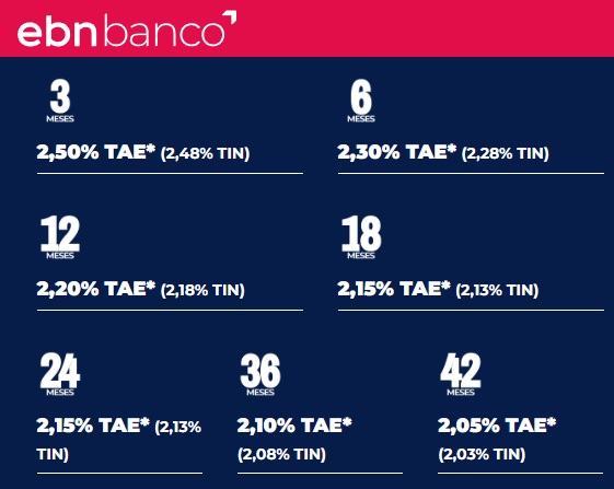 EBN ya sólo ofrece como máximo un 2,5% TAE en su depósito a 3 meses de plazo, y de ahí va bajando hasta el 2,05% TAE a 42 meses de plazo.
