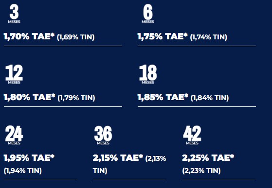 3 de los plazos: 3 meses (1,65% TAE a 1,80% TAE), 6 meses (1,70% TAE a 1,95% TAE) y 12 meses (1,80% TAE a 2,12% TAE), que ahora han sido subidos, fueron bajados a mediados de mes de diciembre.