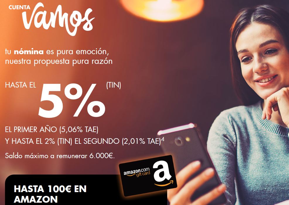 Ibercaja ofrece hasta el 31 de enero de 2019 un Cheque Amazon de hasta 100€ además de una alta remuneración en la Cuenta Vamos que de momento no tiene fecha fin de vigencia.