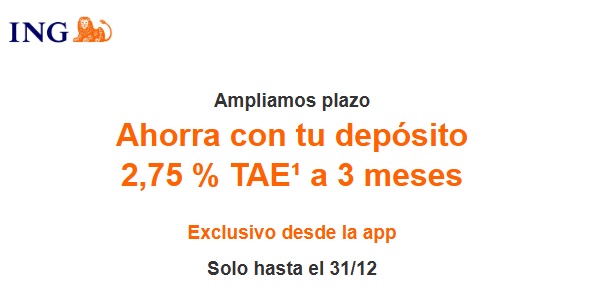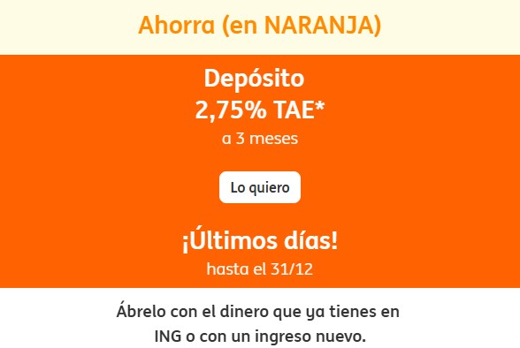 Los clientes de ING disponen aún de 1 semana para contratar su depósito por nuevos ingresos al 2,5% TAE y a 3 meses de plazo.