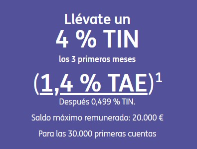 Sigue ofreciendo un 4% TAE en su Cuenta Naranja a nuevos clientes, pero lo clientes deben de conformarse como máximo un 1,85% TAE, pero para un mínimo de 100.000€
