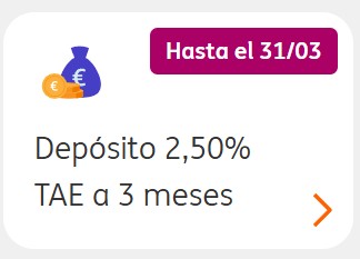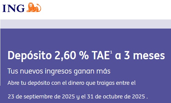 ING amplia hasta el 31 de marzo de 2026 su depósito para dinero nuevo al 2,5% TAE y a 3 meses de plazo que lanzó el banco para clientes del banco el mes pasado.