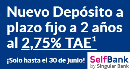 Hace un par de meses Self Bank volvió a la vida ofreciendo una cuenta al 1% TAE, y hoy el banco lanza 2 depósitos bastante interesantes: 2% TAE a 1 año y 2,75% TAE a 2 años de plazo.